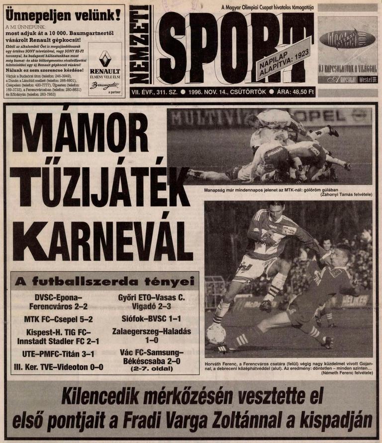 „Az 5. percben Pető baloldali beadását Ilea bólintotta a jobb sarokba, ám Piller játékvezető les miatt érvénytelenítette a gólt. A 14. percben Nicsenko indította Horváth Ferencet, akit a kapujából kifutó Horváth D. elütött. Piller kiállította a kapust, és 11-est ítélt, amelyet Jagodics a csereként beállt kapus, Kövesfalvi mellett a jobb sarokba lőtt (0-1). A 17. percben Madar Cs. szögletét Ilea gyönyörű mozdulattal fejelte a kapu bal oldalába (1-1). Három perccel később Pető és Szatmári adogatott, majd az utóbbi Dombi elé passzolt. A szélső Ilea elé tálalt, aki Szeiler mellett a jobb sarokba gurított (2-1). A 22. percben Horváth F. ment el a jobb oldalon, középre adását Nicsenko futtából lőtte a jobb sarokba (2-2). A 44. percben Pető lopakodott előre, majd 35 méterről fölé lőtt…Varga Zoltán, a Ferencváros vezetőedzője: – Reális, igazságos az eredmény, mert nem játszottunk jól tíz ember ellen. Fej nélkül fociztunk, hagytuk magunkat kicsalogatni a saját térfelünkről. A hajrában, amikor mindkét oldalon tízen játszottak, már nem volt igazi lehetőségünk. A bírók ténykedését inkább nem minősítem…” (1996 – DVSC)