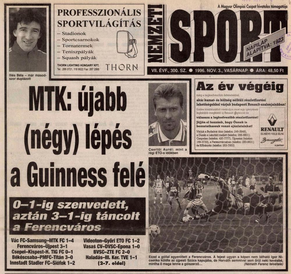 „Némi riadalmat okozott, hogy az újpesti drukkerek szektorában a kezdés előtt egy rakéta (vagy petárda?) valami éghetőt fölgyújthatott, mert csúnya, fekete füst emelkedett a vendégszektorból az ég felé. A 17. percben Véber ügyesen pöccintett szabadrúgásból Szanyó elé, aki 18 méterről óriási erővel a bal felső sarokba bombázott (0-1). Szünet után nagyon rátaposott a gázra a zöld-fehér legénység. A 49. percben egy jobb oldali beadást Nicsenko most nagyon pontos “radarral” indított útjára. A labda a bal alsó sarokba került úgy, hogy Szűcs azt már igazán nem védhette (1-1). A 77. percben Hrutka 17 méteres szabadrúgása a felső kapufáról vágódott ki. De még nem volt vége a veszélyidőszaknak, mert Zavadszky pontosan emelt keresztbe a bal oldalon helyezkedő Nicsenkóhoz. Az ukrán “Igor herceg” lapos labdája ezúttal is célba ért, megszerezte a vezetést csapatának (2-1). Látszott, az ÚTE innen már nem tud talpra kerekedni. Hát még amikor a 80. percben Jagodics a “kígyó térről” bombázott be egy újabb gólt. Olyan találat volt ez 34 méterről, amiről igazán sokan fognak még beszélni; a labda vércseként csapódott be a jobb alsó sarokba (3-1).” (1996 – Újpest)