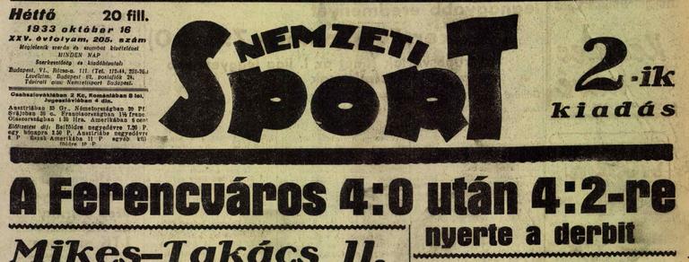 „Az őszi idény első derbija rangjához méltó játékot, élvezetes küzdelmet és a játék képe alapján reális ferencvárosi győzelmet hozott. Látszott, hogy mindkét csapat nagyon felkészült a küzdelemre. Dicséretméltóan fair volt a játék, amelyet valóban élvezett az őszi idény során még bajnoki meccsen sohasem látott nagyszámú közönség. Szinte tavaszias, szép napsugaras idő köszöntötte a derbi közönségét, amely legnagyobb részében már az előmérkőzésen elfoglalta helyét a lelátón. Feltűnő volt, hogy milyen népszerű lett a közönség körében a B-tribün. Persze mostanság már jólesik egy kis napsütés. A régi derbik levegőjét varázsolták az FTC-pálya öreg tribünjei közé az egész nézőtéren körülfutó tömött sorok. A B-tribün aljában szorosan egymás mellett helyezkedett el a két klub szurkolóinak tábora. A zöld-fehér zászló a félvonal irányába lengett, a lila-fehér odább a klubház felé. A nagytribünön politikai és művészeti világ kiválóságai, lenn fojtott izgalom és várakozás…A Ferencvárosnak ment jobban a játék ezen a derbin. Hiába! A honi pálya le nem mérhető, inkább ösztönszerűleg érzett előnye sokat jelent akkor, amikor tudásban, felkészültségben egyenlő ellenfelek csapnak össze egymással.” (1933 – Újpest)