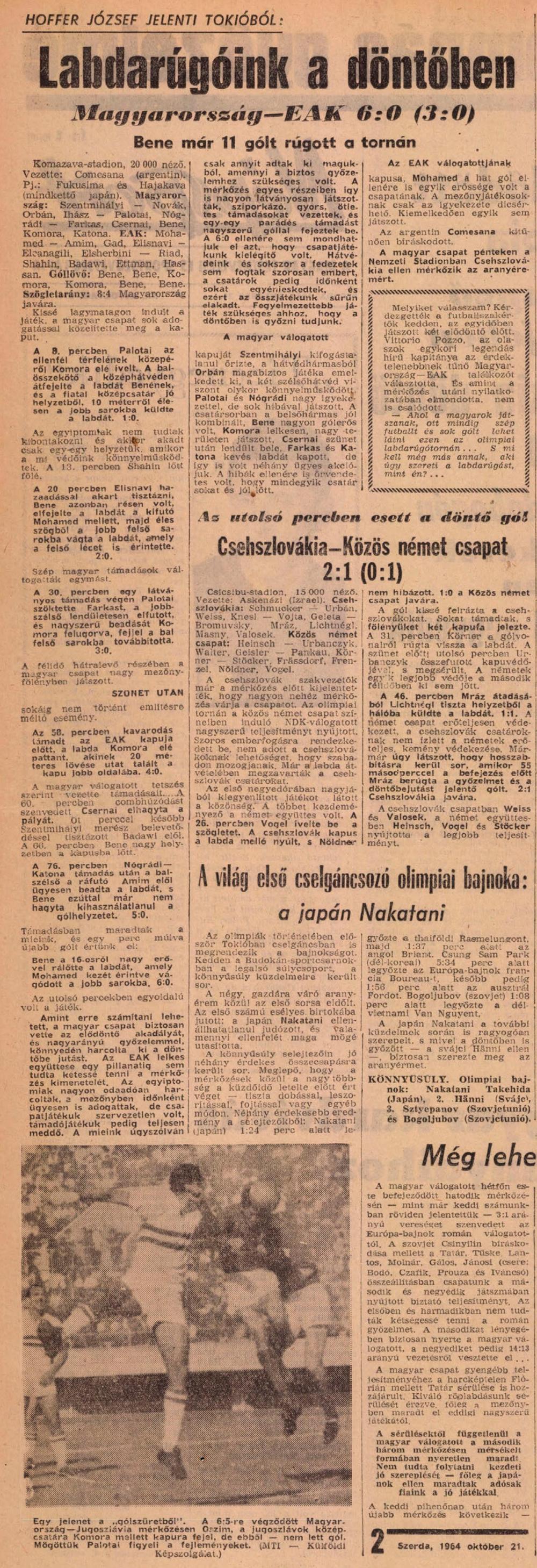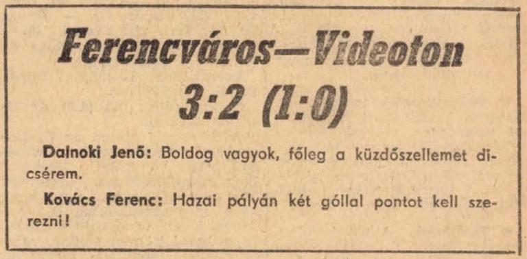 „Akik a legutóbbi 6:2-s győzelem után ismét hasonló eredményt vártak – csalódtak. Alaposan meg kellett küzdenie a Ferencvárosnak a győzelemért. A Csepel elsősorban védelmi hadrendjét igyekezett jól megszervezni, különös gondot fordítottak Albert őrzésére. Volt időszak, amikor három csepeli csatár tartózkodott elől, akik rajtaütésszerűen veszélyes helyzeteket tudtak teremteni. A Ferencváros nagy lendülettel rohamozott, de a tömör csepeli védőfalat nehezen bírták áttörni. Később fokozatosan javult fel a zöld-fehérek csapatjátéka, néhány gyors, ötletes kombináció fel tudta lelkesíteni a hidegre fordult esti időben a nézőket. A Csepel nehezen adta meg magát és még 2:0 után sem nyugodott bele a vereségbe. A Ferencváros javuló formát mutatott lelkes, gólratörő játékával és megérdemelte a győzelmet.” (1965 – Csepel)