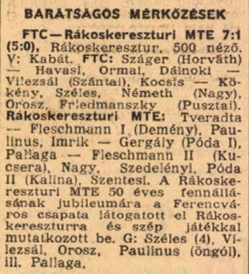 1962. Rákoskeresztúri MTE – Ferencváros 1:7, Jubileumi mérkőzés