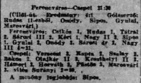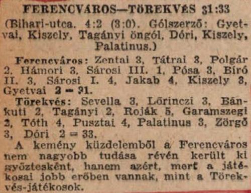 „— Először játszik a Fradi itthon – hallani mindenfelé. Mosolygósan az arcok! Lent az öltözőben is jó a hangulat. Beretvapengéket kapnak a játékosok. Új gyártmány. A kis Taki is kap: — Ilyen éles legyen a lövésed – mondják neki. Taki mosolyog…A végén már alig mosolygott, hiszen nagyon keservesen szerzett két pontot a Fradi, s igazán annak köszönheti a győzelmet, hogy már a mérkőzés elején megszerezte a maga két dugógólját. A Fradinak az első félidőben, az akkor még gyengélkedő Szeged ellen, sokkal több gólt kellett volna rúgni, csak a Ferencváros szerencséjének tudható be, hogy az első félidőbeli két gól elég volt a győzelemhez. Egyébként Fradi szerencséről nem lehet beszélni, sőt határozottan pechjük volt tegnap a zöld-fehéreknek. A csatársornak sehogy sem ment a góllövés. A játék az már ment valahogy. Helyenként döcögött, máskor ki-ki robbant, de az eredmény csak annyi volt, hogy két mérkőzésre való helyzetet hoztak össze – és hagytak ki.” (1933 – Szeged)