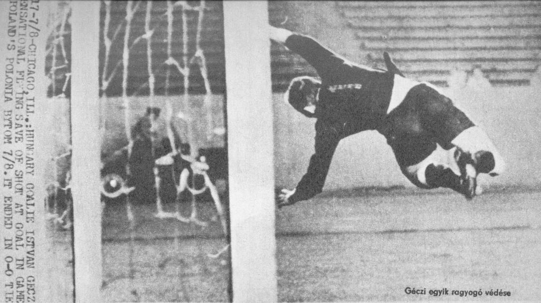 Párás időben, kissé csúszós talajon indult a mérkőzés (Felállításunk a „standard”, azzal, hogy az első félidő végén a sérült Mátrai helyére Páncsics állt be.) És mindjárt úgy, ahogy vártuk: a lengyelek — akiknek egyébként ez volt az első kinti mérkőzésük —, ahogy mondani szokták „ami belefér”, mindent beleadtak. Számunkra váratlan volt rakétaszerű gyorsaságuk, kitűnő labdakezelésük, határozottságuk. Szinte lélegzetvételnyi szünet nélkül hajtottak. Az első percek meglepődése azonban csakhamar alábbhagyott a fiúknál — közben Géczi Pista néhányszori bebizonyította egyre szélesebb skálájú, a legszebb reményekre jogosító képességeit — kezdtek focizni. A 30. perc jellegzetes Albert-alakítást hozott: először a balösszekötőjükön, majd a középhátvédjükön, utána keresztező balhátvédjükön ment át, kicsalta a kapust — az egyik válogatottjukat — is a helyéről s utána belsővel, félmagasan és félerősen az üres kapura küldte a labdát, amelyet kétségbeesetten berohanó jobbhátvéd kézzel ütött ki a gólvonalról. Egyetlen lengyel sem reklamált, amikor a bíró a 11-es pontra mutatott. Mutatni ugyan mutatott, de amikor rá akarta tenni a labdát — nem találta a jellegzetes fehér keresztet. Mit tehetett? Kimérte. Jókora, megnyújtott léptekkel. Magyarázták is neki a fiúk, hogy ez nem tizenegy, hanem legalább tizenhárom méter, de nem engedett. Rálépett a labdára s intett, hogy hagyják el a tizenhatos területét a többiek. Novák Dezső már ott állt labda mögött. A fütty után a maga szokott, apró lépteivel kezét lóbálva nekiindult és — szokásától merőben eltérően — belsővel telibe találta a bal kapufát. Akárhogy is, ma sem tudok szemrehányást tenni neki ezért. Ha van biztos büntető-rúgó, ő az. Szinte kicentizi a labda útját. A két méter távolságkülönbségre nem volt képes átállítani magát hirtelen.