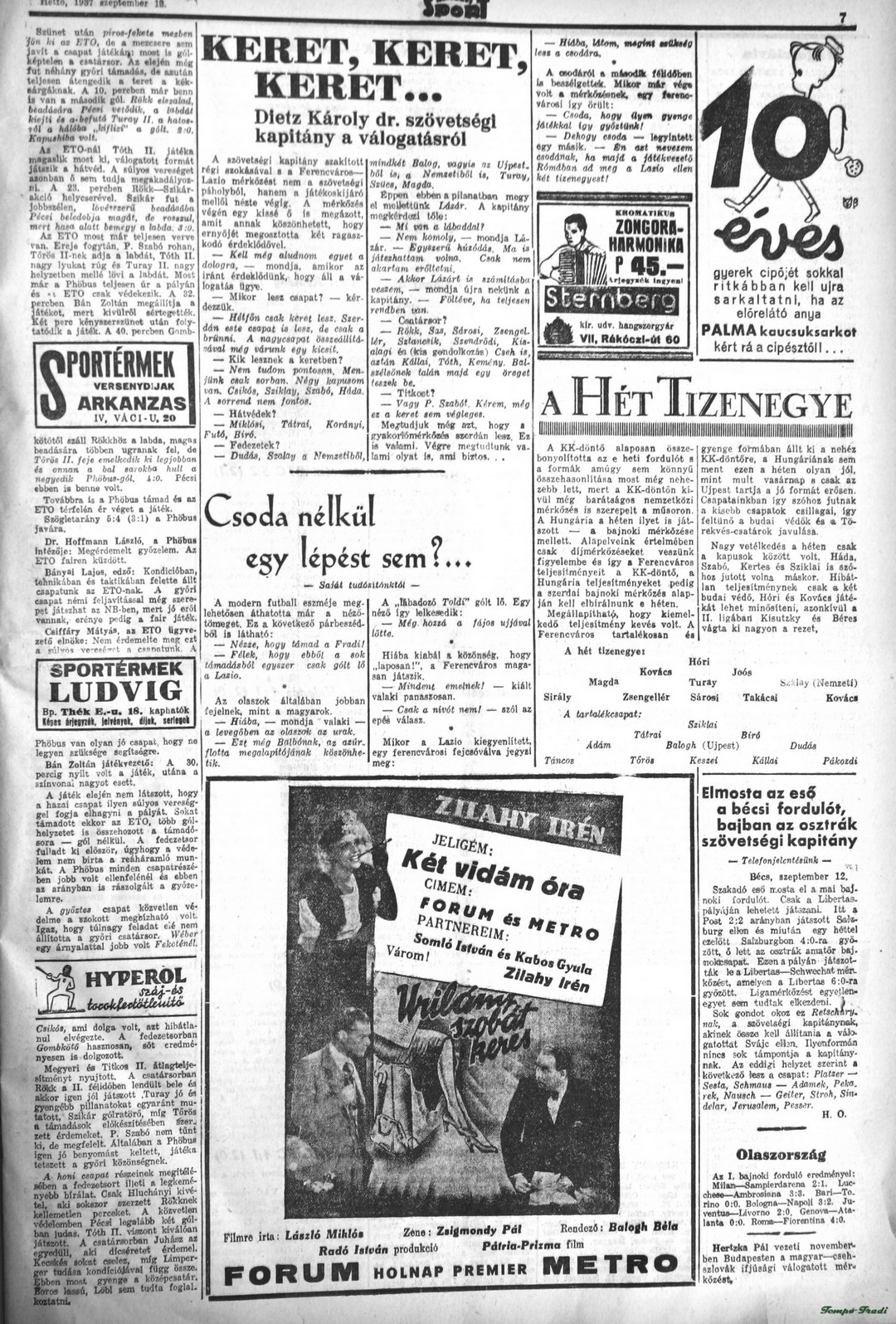 Talán emiatt is nem fogadta túl nagy lelkesedés és túláramló öröm az 1937. szeptember 12.-i KK döntő első mérkőzésén aratott 4:2-es győzelmet az olasz Lazio ellen. Mivel magáról a mérkőzésről az egyik muzeális lapszemlénkben részletesen foglalkoztunk, így most inkább a találkozó utózöngéit tárjuk a kedves olvasók elé. Mindezt a kor újságírói, a rájuk jellemző „anekdotázó” stílusban szellemesen, de nagyon tanulságosan tárják elénk. Az anekdota, mely görög eredetű és már az időszámításunk előtt is létezett, hazánkban Móricz Zsigmond, a Nyugat című folyóiratban megjelent írásaival tette népszerűvé. Az anekdota olyan jellemzően csattanóval végződő írás, mely létező személyekhez, eseményekhez kötődik még akkor is, ha azok kitaláltak.