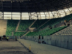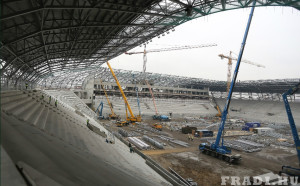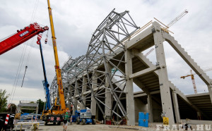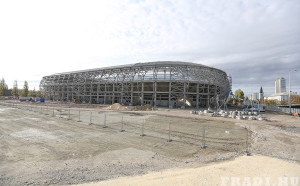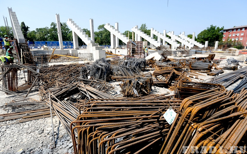A „pályán” egyelőre még nem a játékosok, hanem a munkások végzik fontos teendőiket. A leendő középkörtől nem messze egy acélhajlítógép dolgozik szorgosan, amellyel az acélszerkezet hiányzó darabjait készítik elő.