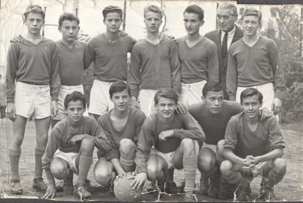 Hajabács Géza kölyökcsapatában; az álló sor közepén Varga Zoli, alul balról a második Bicskei Berci, az utolsó Rátkai Laci (Fotó: Varga Zoltán gyűjteményéből)