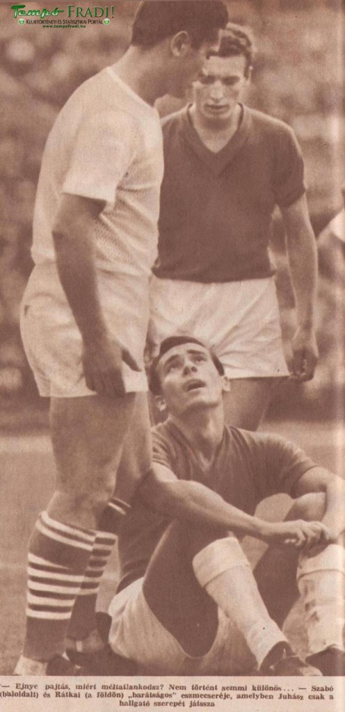A következő év nyarán Szombathelyre jött a Fradi. Komoly gyomorrontással bajlódtam, de edzőm, Tátrai Pubi azt mondta, játszanom kell, mert különben azt fogják mondani, hogy betojtam. Játszottam, belőttem az egyenlítő gólunkat, majd cserét kértem. Nem engedtek le. Újabb gólommal már vezettünk: fejjel megelőztem Géczi Pistát, pedig nagyon ritkán sikerült gólt fejelnem. Na, akkor lemehettem. A zuhany alatt két nagy morajt hallottam: az első az egyenlítésnek, a második a Fradi győztes góljának szólt. A Népsport tudósítója megdicsért a góljaimért, de megjegyezte, hogy erőnléti hiányosságaim vannak …