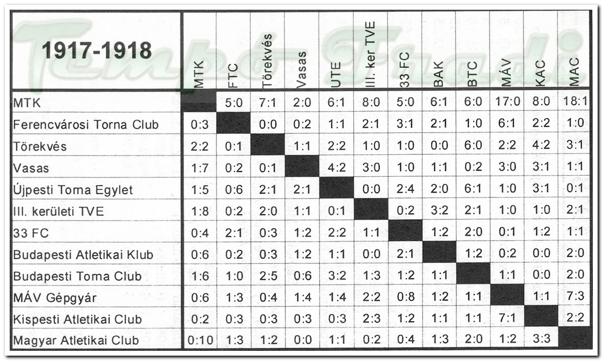 | Az 1917/18. évi hadibajnokság végeredménye | ||||||