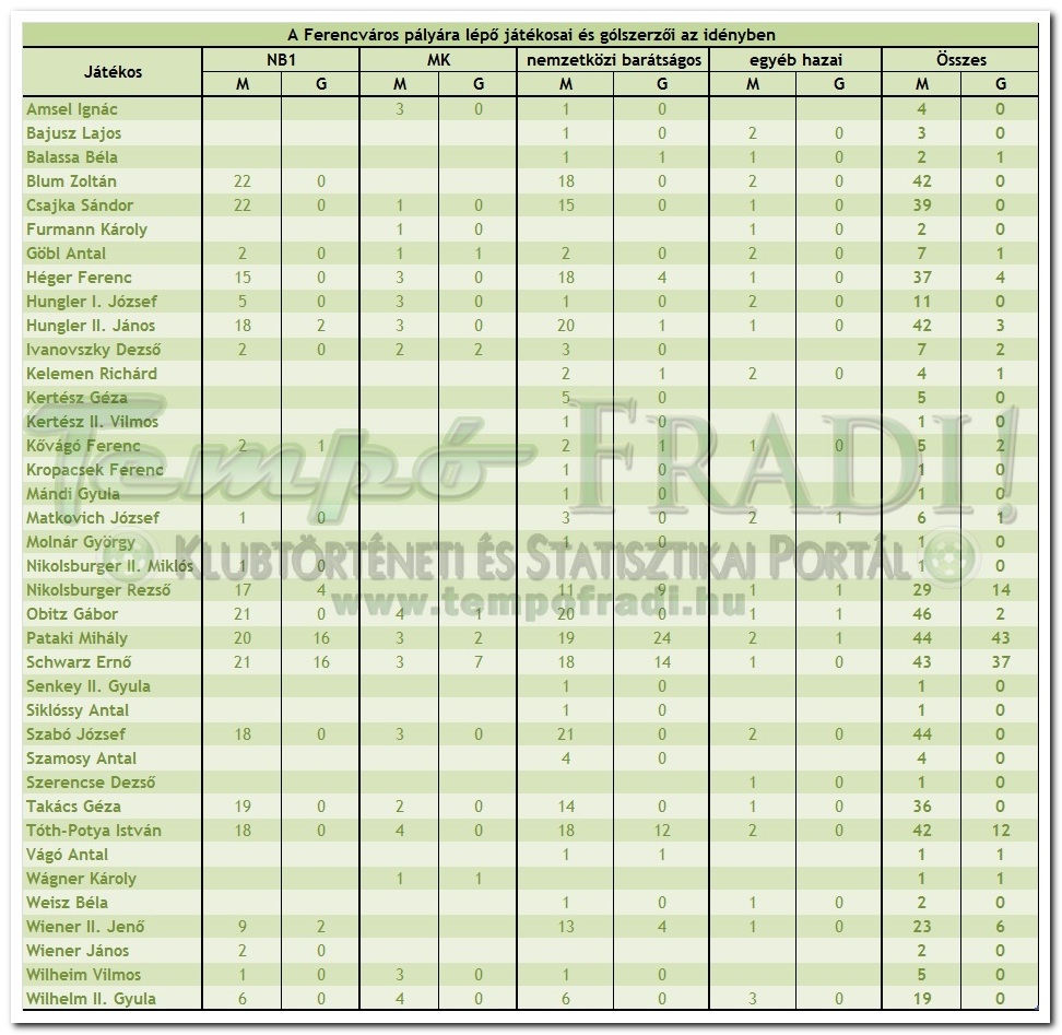 FTC: Csajka – Hungler I., Hungler II. – Szabó J., Obitz, Blum – Tóth-Potya, Nikolsburger, Pataki M., Schwartz E., Héger
