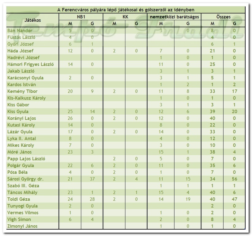 Ferencváros: Kutasi K. – Bán, Korányi L. – Hámori, Móré, Lázár – Mikes, Polgár, Sárosi, Toldi, Kemény
