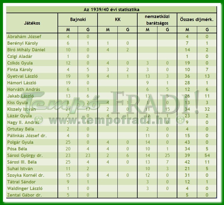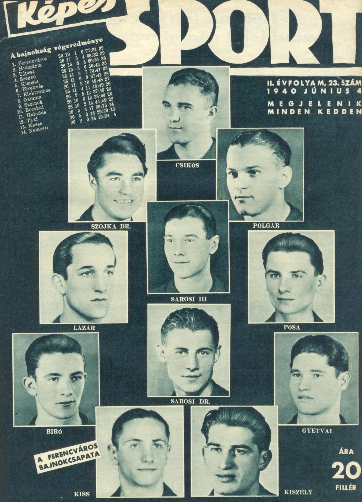 Ferencváros: Csikós – Tátrai S., Polgár – Kiss Gyula, Sárosi III., Pósa – Suhai, Finta, Sárosi, Jakab, Gyetvai
