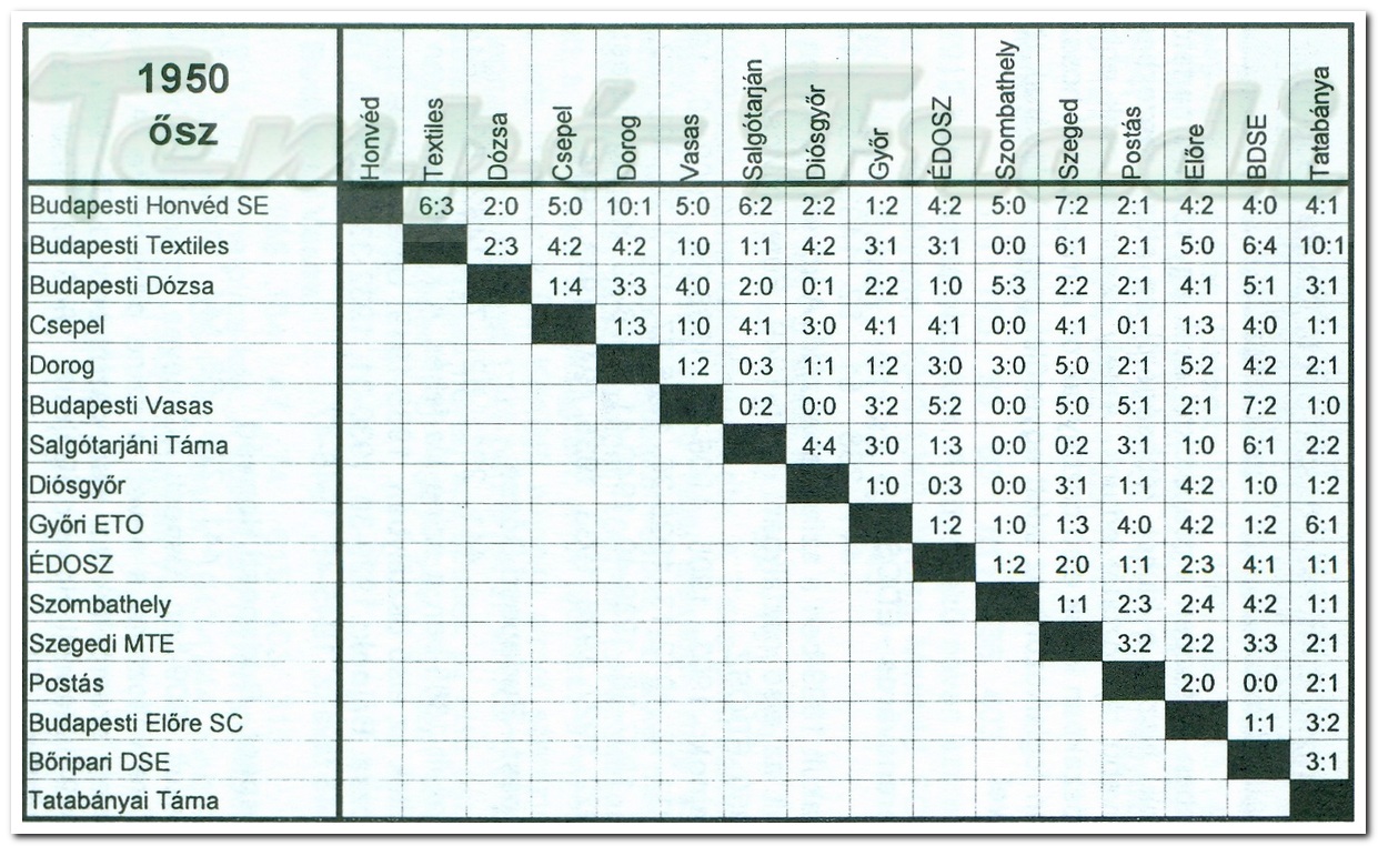 Átálltunk a naptári év szerinti beosztásra, s az így üresen maradó 1950. évi őszt egyfordulós, kiesés és feljutás nélküli bajnokság töltötte ki. Ezt a Grosiccsal, Kocsissal, Budai II-vel megerősödött Bp. Honvéd biztosan nyerte. Ekkor engedélyezte az MLSZ először a játékoscserét: kapust és egy mezőnyjátékost lehetett cserélni. (Hoppe László)