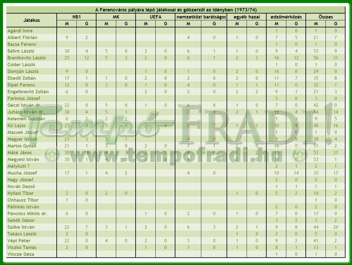 Vezetőedző: Csanádi Ferenc szakedző (1973. október 20-ig) majd Dalnoki Jenő (1973. október 20-tól)
