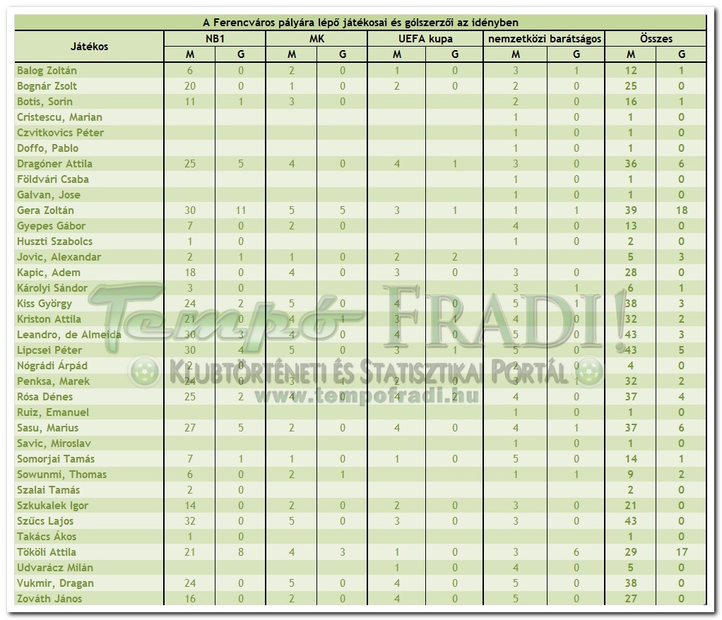 Felső sor: Kiss Gy., Sowunmi, Gyepes, Dragóner, Botis, Kriston, Balog Z. Harmadik sor: Somorjai, Vukmir, Jovic, Szabó K., Udvarácz, Kapic, Bognár, Károlyi. Második sor: Haaz Ferenc technikai vezető, Lipcsei Gábor gyúró, Somodi László erőnléti edző, Pölöskei Gábor edző, Garami József szakmai igazgató, Józsa Miklós kapusedző, Czakó Péter szertáros, Eisemann László gyúró, Szeiler József cégvezető. Elől: Leandro, Sasu, Gera, Lipcsei, Szűcs L., Huszti, Rósa, Penksa, Zováth