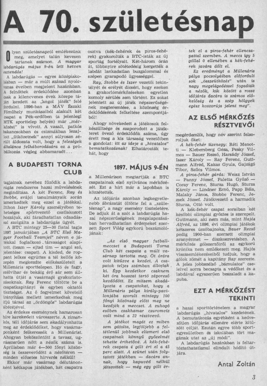 Ma tartja meg a Budapesti Torna-Club football-osztálya az első matchet az első és második csapat között. Hazánkban ez az első football-match, mely az Association-játék angoli szabályai szerint tartatik meg. A csömöri-úti millenáris pálya gyepén van kitűzve a játék tere — ugyanott, a hol közel három hónapja szorgalmasan, gyakorolják a játékot a B. T. C. csapatjai. A mai match tekintettel a M. Testgyakorlók Körének országúti versenyére 5 órakor kezdődik s a mindenfelé küldött meghívók, a match széles körű publikácziója minden esetre szép nézőközönséget fognak biztosítani a viadal számára. A match tulajdonképen »próbája« a B. T. C. football alosztályának, melyből meg akarja ítélni a két csapat, mely játékosait válogassa ki a bécsi »Football- és Cricket-Club« kihívására. Ez utóbbi match az ősz előtt alig kerül döntésre, de annál érdekesebb lesz szemlélnünk a mai küzdelmet, melyben a résztvevő ambiczióját az is növeli, hogy a kiküldendő magyar csapatba való felvételükre a mai játékon is kimutathatják képességeiket. Mindkét csapat nagy paszszióval készült a matchre — bár a II. csapat (vörös-fehérek) biztosra veheti legyőzetését a kék-fehérek által.