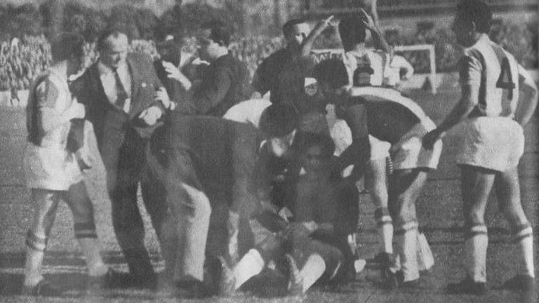 Egy kis botrány a sok közül. Edző, elnök, gyúró – civilek a pályán. Hátul Musztafa fohászkodik Fenczl-hez!