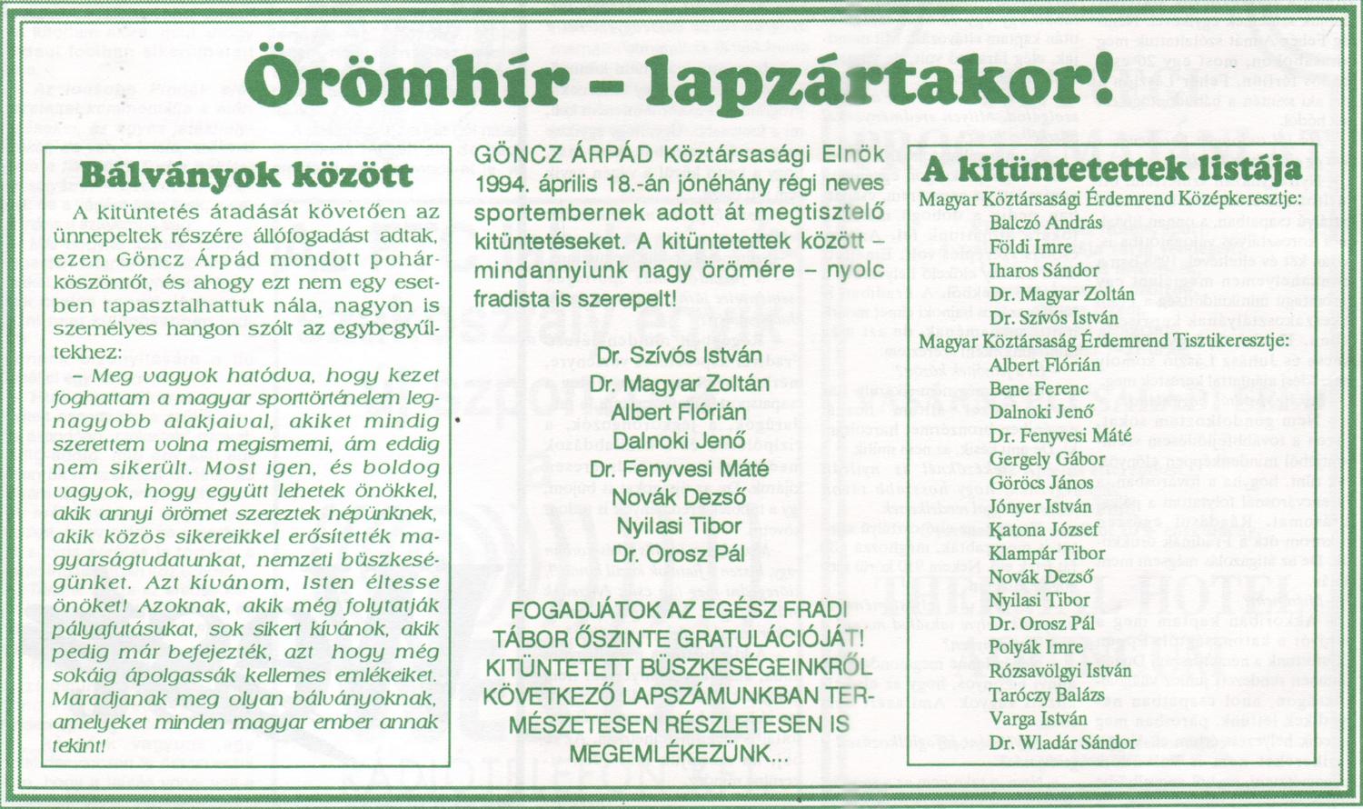 Kategória: Hírek, események | Címke: Albert Flórián, Dalnoki Jenő, Fenyvesi Máté dr., fh, Göncz Árpád, kitűntetések, Magyar Zoltán (tornász), Novák Dezső, Nyilasi Tibor, Orosz Pál dr., Szívós István dr.