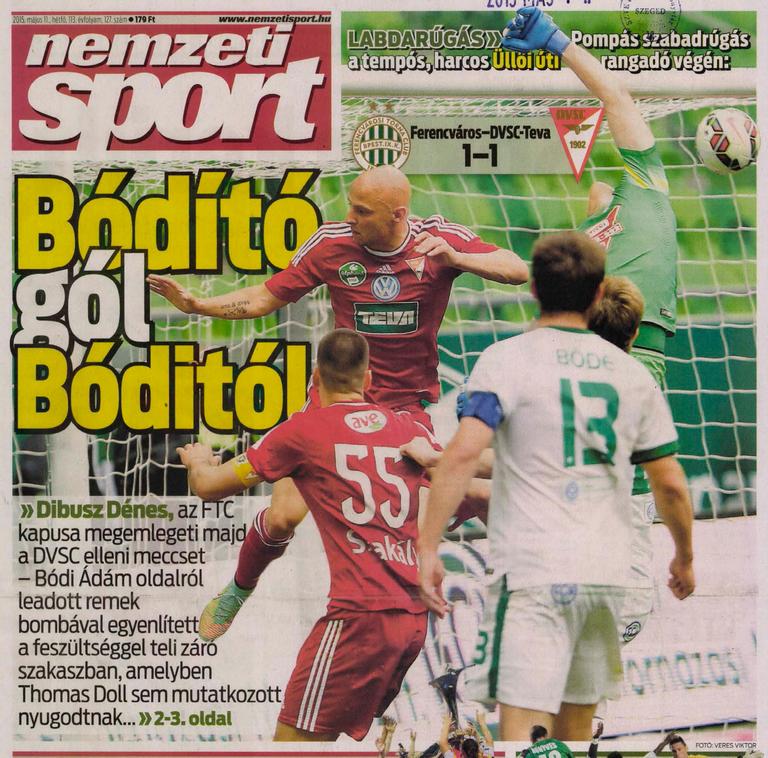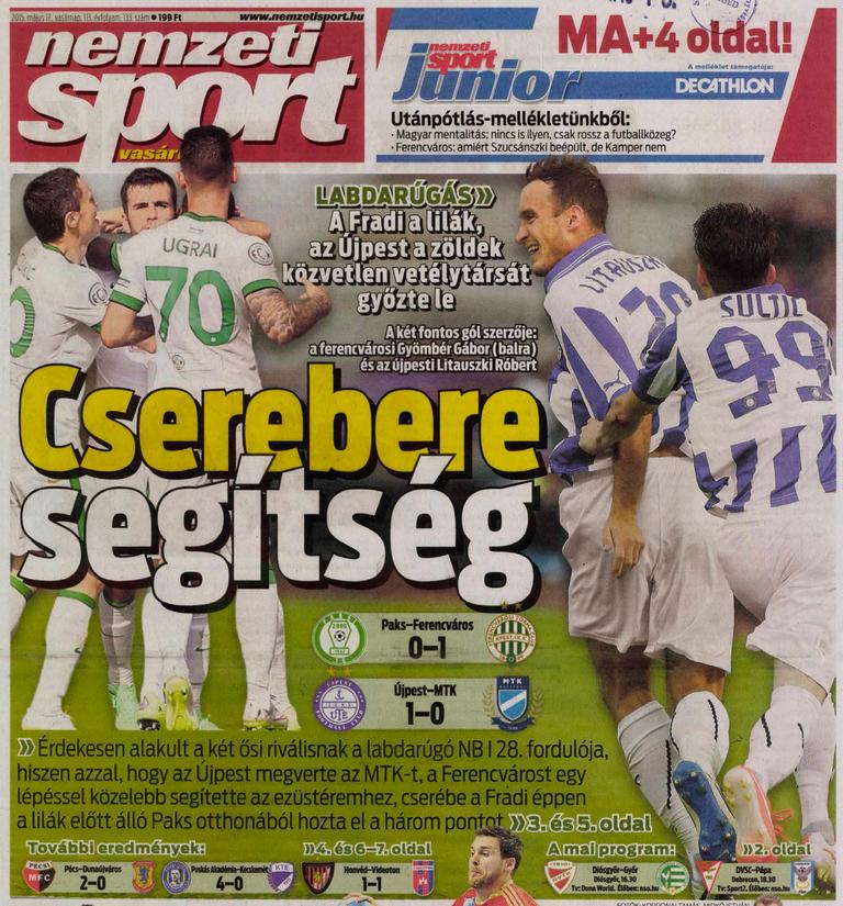 A Ferencváros 2–0-ra megverte odahaza a friss bajnok Videotont a labdarúgó NB I harmincadik, záró fordulójában. A Ferencváros lett tehát az egyetlen csapat a 2014–2015-ös szezonban, mely hazai pályán megőrizte veretlenségét, sőt, tétmérkőzésen még összességében is veretlen az új stadionjában. A tavasz végére alaposan átalakult a Videoton, amely még szemmel láthatóan nem áll készen a nyári BL-kalandra.