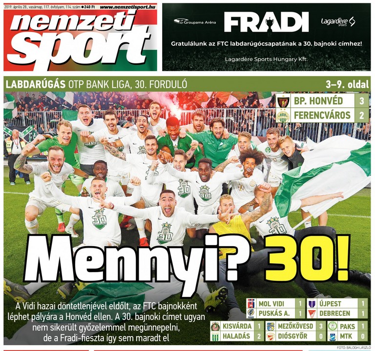 Most sem nyert a Fradi Felcsúton, de ezt kevés szurkolója bánta, hisz ünnepelhették a 30. bajnoki címet.