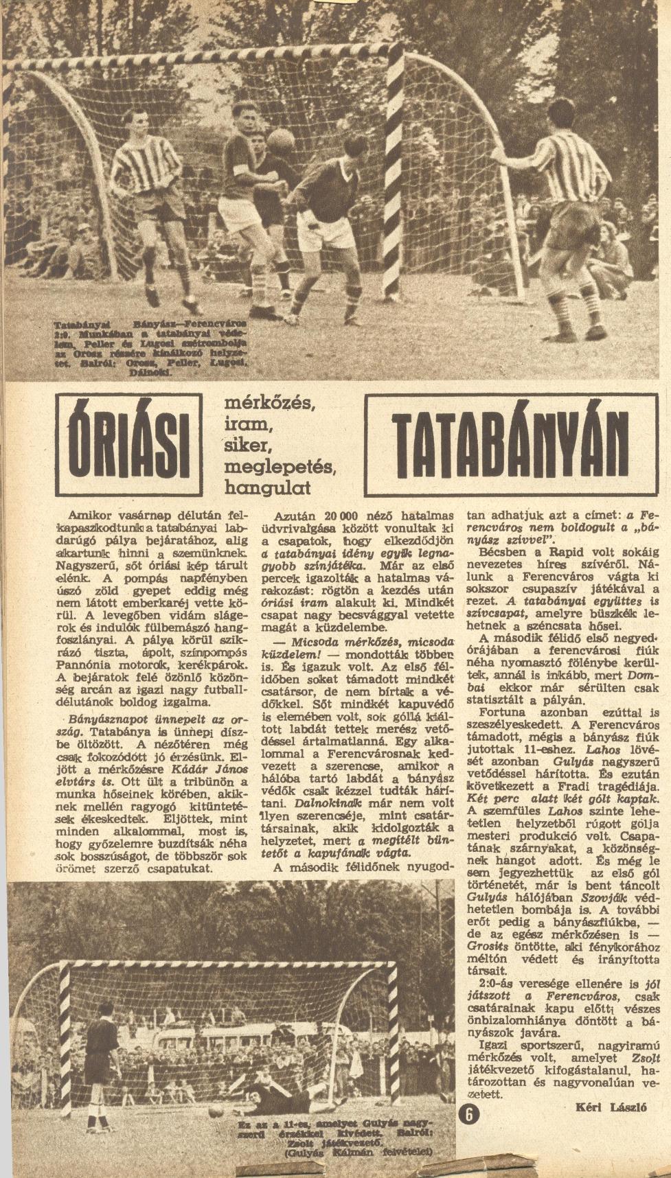 A Tatabánya első győzelmét a Fradi ellen 1957.IX.1-én aratta hazai környezetben. „20 ezer néző, zászlók és színes léggömbök lengtek a levegőben, szerte a városban vidám bányászok.” Ünnepi volt a hangulat a 7. bányásznapon, a nézőtéren ott ült Kádár János és a „baráti országok bányász-szakszervezeti küldöttsége” is. Egy ilyen ünnepi napon ki más lehetett volna az ellenfél, mint a Ferencváros? Egy különvonatnyi ferencvárosi közönség örömére a mérkőzés elején sokkal többet támadtunk, de kimaradtak a helyzetet, mely a foci „törvénye” szerint meg is bosszulta magát. A Lakat Károly által dirigált hazaiak a második félidőben kétszer is bevették Gulyás kapuját és nagy meglepetésre legyőzték a Fradit, ezzel tették még nagyobb ünneppé a bányászok napját.