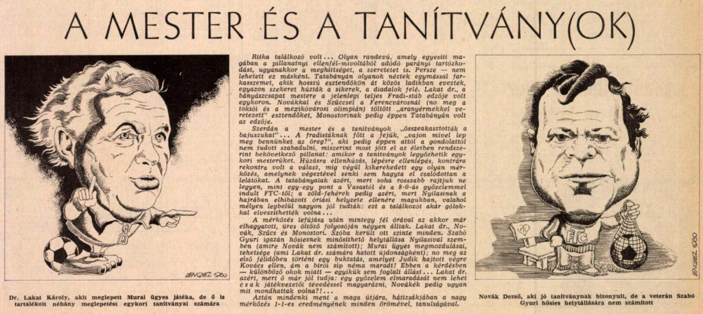 1968.III.10-én Tatabányán a „Ferencváros javuló játékot mutatva, megérdemelten, biztosan győzött” (4:2). A kispadokon volt ferencvárosi játékostársak ültek, Lakat Károly és Hári László 1950 és 1952 között több mérkőzésen játszottak együtt, Lakat fedezetként számos „forintos” labdával indította a csatár Hárit, aki a Fradi saját nevelésű játékosa volt, és 1953 őszén igazolt Tatabányára. 1968.VIII.27-én, a Népstadionban Varga Zoli tartott „foci-sulit”, 4:1-re vertük a Tatabányát úgy, hogy mind a négy gólunkat a legendás nyolcasunk szerezte. A győzelem „hátterében” forrongott Európa, diáklázadások Párizsban, Belgrádban, augusztus 20-án a szovjet tankok bevonultak Prágába – a magyar tankok pedig a Felvidékre. Ilyen feszült helyzetben folytatódott a bajnokság, amit egy pont előnnyel nyertünk meg a Dózsa előtt, ezzel megvédve a bajnoki címünket. A kispadon Lakat Károllyal, a „Tanár úrral”, aki 1967 és 1969 között 147 alkalommal dirigálta a Fradit, és aki 1957 és 1962, majd 1970 és 1974 között a Tatabánya kispadján ült, ezzel csúcstartó is a Tatabányai labdarúgás edzői között.