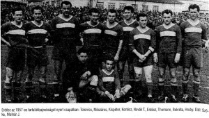 Egyébként a „fakó” a következő összeállí­tásban játszott: Szőke Gy. – Thomann, Kispéter, Hruby – Schléger, Bokréta – Láng II, Láng K., Takács Lajos II, Mészáros J, Novák. (Ez a Novák nem azonos Dezsővel, aki akkor még a Haladásban játszott balösszekötőt. Rajta kí­vül az első csapatban soha nem játszottak Schléger, Bokréta, Láng II.) Góllövők: Takács 3, Láng II, Mészáros.