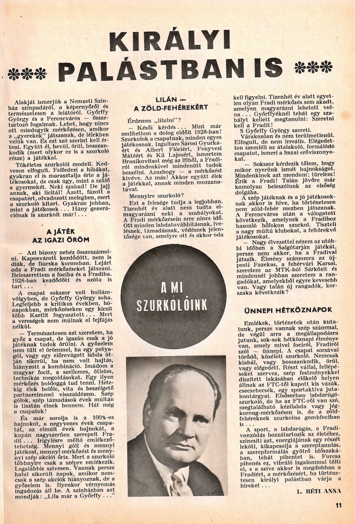 Szerepeiben, mint ahogy a lelátón is, büszkén vállalta: nem csak a főszereplőkről szól a játék. Hallassék hát a kiváló epizodista hangja! És kívánom, hallják meg mindazok, akik ma is, hozzá hasonlóan, lilulnak egyes produktumok láttán. Ez az archív cikk is bizonyítja, nincs új a nap alatt. A ma problémái a múltban is előfordultak, nem mindig ment úgy a csapatnak, ahogy a szurkolói elvárták. A legfontosabb kérdés az Ő korában is az volt, mikor lesz ismét bajnok végre a Fradi? Ugye ismerős! Vegyük át a válasz laza könnyedségét is: türelem, érik a Fradi! A ma ugyanúgy türelmetlenkedőknek elárulom, megérett és bajnok lett a Fradi. Mert a Fradi bajnoknak született!