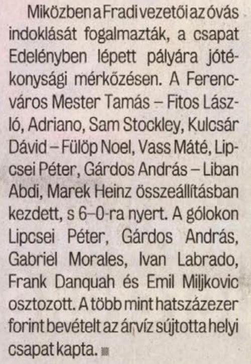 Labdarúgócsapatunk 6-0-ra nyert Edelényben jótékonysági meccsen. Góljainkat Lipcsei, Gárdos, Morales, Labrado, Danquah és Miljkovic szerezték. Több mint 600 ezer forinttal segítettük az edelényieket.