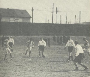 Ez alatt 22 részben már dereshajú, de ifjú szívű sportember, az FTC és az OTE 25 év előtti első csapatainak 6—6 tagja kiegészítve a legelső időkben már játszó, ma már valóban öreg fiúkkal átkocsizott az FTC régi pályájára, a Soroksári úti, jelenleg KAOE pályára, ahol a KAOE teljes elnöksége üdvözölte a 25 éves FTC-t és átnyújtotta a KAOE — babérkoszorúzta labdát ábrázoló — hatalmas bronzplakettjét. A fotográfusok és mozioperatőrök seregének elvonulása után megkezdődött a kétszer 10 perces futballmérkőzés a 25 évvel ezelőtti bíró Kakas Gyula sípjelére. Az FTC összeállítása ez volt: Weisz István — Gabrovitz E., Gabrovitz K. — Taffel, Soóky, Békés — Kovács, Mertl, Horváth, Aczél, Hahn.