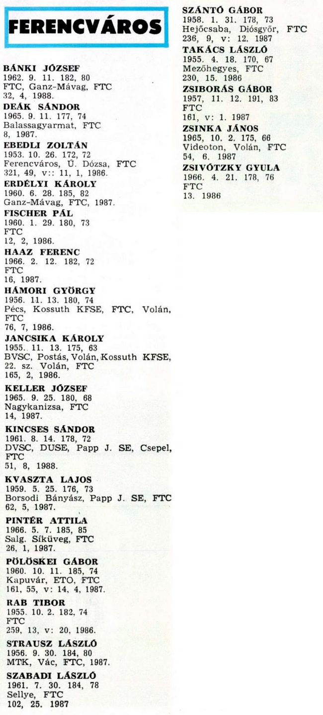Kategória: Játékoskeret | Címke: 1985/86, Bánki József, Baumgartner László, Borbély László, Csiba László, Dalnoki Jenő, Deák Sándor, Dukon Béla, Ebedli Zoltán, Erdélyi Károly, Fischer Pál, Haaz Ferenc, Hámori György, Jancsika Károly, játékoskeret, Keller József, Kincses Sándor, Koch Róbert, Kvaszta Lajos, Lanczkor Sándor, Meszes János, Molnár Tibor, Pintér Attila, Pogány László, Pölöskei Gábor, Rab Tibor, Simon Tibor, Strausz László, Szabadi László, szakmai stáb, Szántó Gábor, Takács László, Vajda Zsolt, Varga Gábor, Zsiborás Gábor, Zsinka János, Zsivótzky Gyula