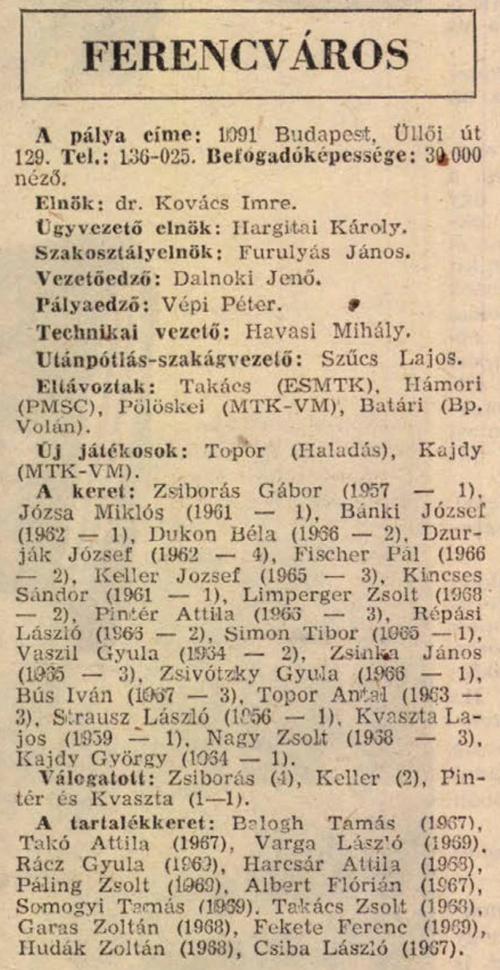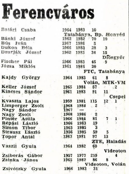 Kategória: Játékoskeret | Címke: 1987/88, Albert Flórián ifj., Balogh Tamás, Bánki József, Batári Csaba, Bús Iván, Csiba László, Dalnoki Jenő, Dukon Béla, Dzurják József, Fekete Ferenc, Fischer Pál, Furulyás János, Garas Zoltán, Harcsár Attila, Hargitai Károly, Havasi Mihály, Hudák Zoltán, játékoskeret, Józsa Miklós, Kajdy György, Keller József, Kincses Sándor, Kovács Imre dr., Kvaszta Lajos, Limperger Zsolt, Nagy Sándor I., Nagy Zsolt, Páling Zsolt, Pintér Attila, Rácz Gyula, Répási László, Simon Tibor, Somogyi Tamás, Strausz László, szakmai stáb, Szűcs Lajos (fedezet), Takács Zsolt, Takó Attila, Topor Antal, Varga László, Vaszil Gyula, Vépi Péter, Zsiborás Gábor, Zsinka János, Zsivótzky Gyula