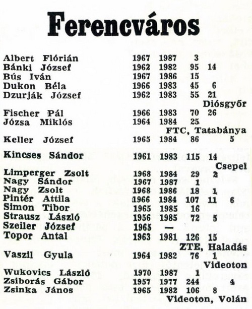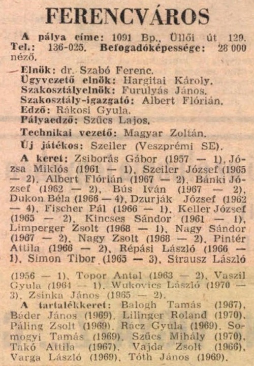 Kategória: Játékoskeret | Címke: 1988/89, Albert Flórián, Albert Flórián ifj., Báder János, Balogh Tamás, Bánki József, Bús Iván, Dukon Béla, Dzurják József, Fischer Pál, Furulyás János, Hargitai Károly, játékoskeret, Józsa Miklós, Keller József, Kincses Sándor, Lilinger Roland, Limperger Zsolt, Magyar Zoltán (sportvezető), Nagy Sándor I., Nagy Zsolt, Páling Zsolt, Pintér Attila, Rácz Gyula, Rákosi Gyula, Répási László, Simon Tibor, Somogyi Tamás, Strausz László, Szabó Ferenc dr., szakmai stáb, Szeiler József, Szűcs Lajos (fedezet), Szűcs Mihály, Takó Attila, Topor Antal, Tóth János, Tóth József, Vajda Zsolt, Varga László, Vaszil Gyula, Wukovics László, Zsiborás Gábor, Zsinka János