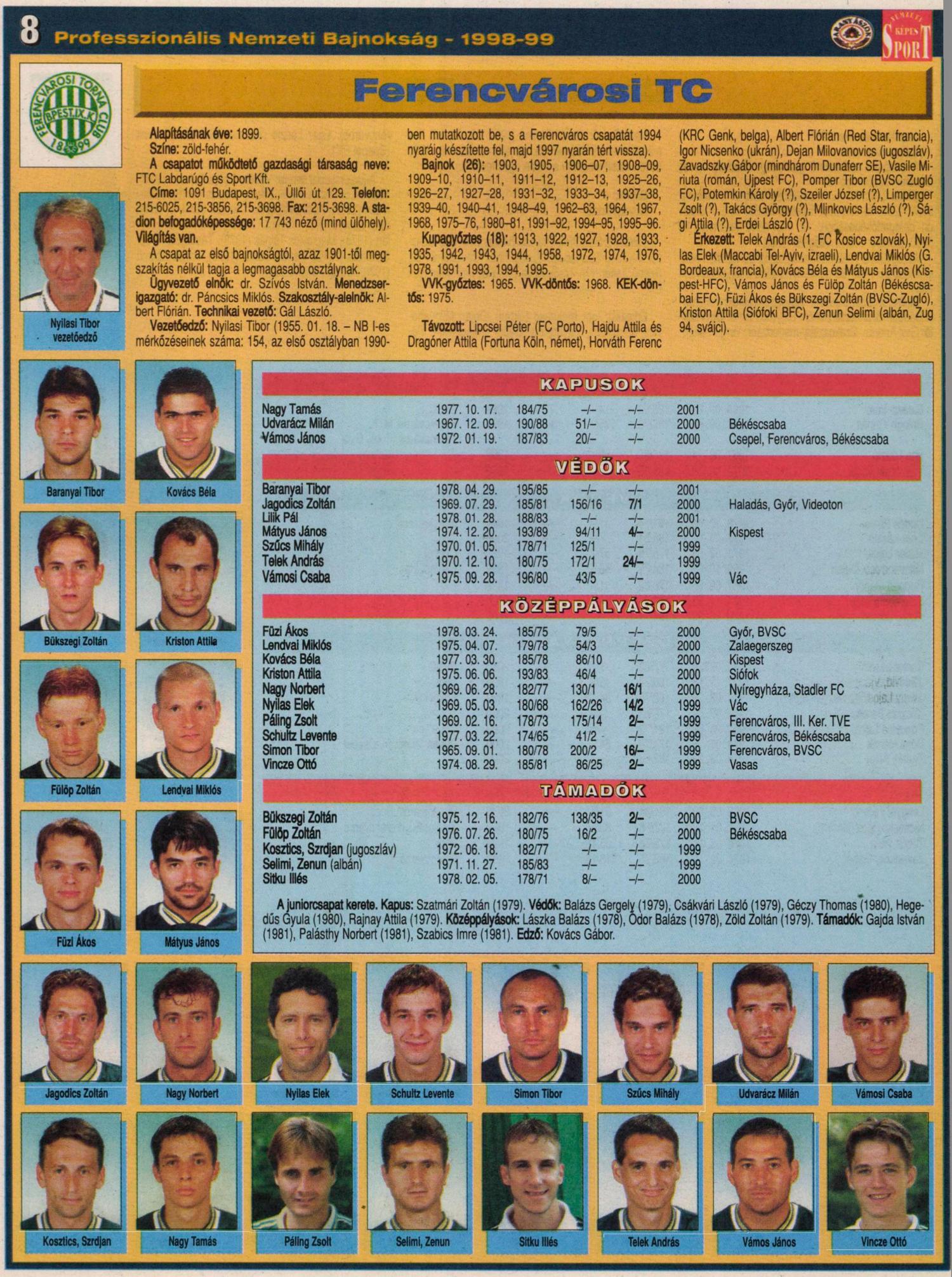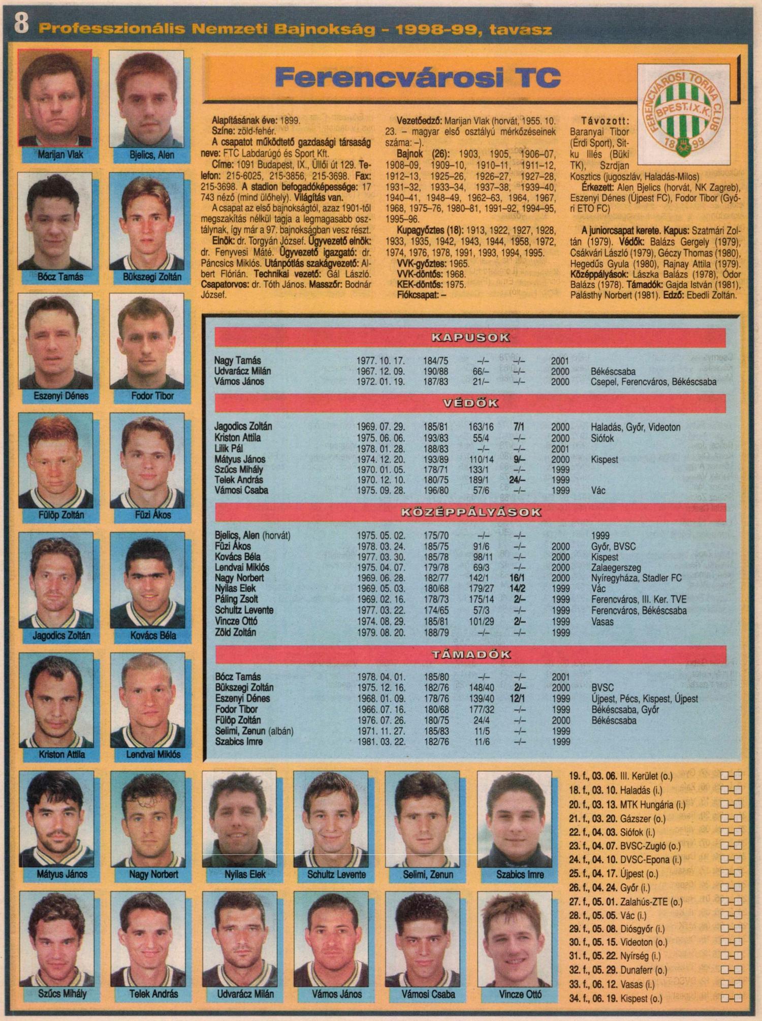 Kategória: Játékoskeret | Címke: 1998/99, Albert Flórián, Balázs Gergely, Baranyai Tibor, Benedek Fülöp, Bjelic Alen, Bócz Tamás, Bükszegi Zoltán, Csákvári László, Eszenyi Dénes, Fenyvesi Máté dr., Fodor Tibor, Fülöp Zoltán, Füzi Ákos dr., Gajda István, Gál László, Géczy Thomas, Hegedüs Gyula II., igazolások, Jagodics Zoltán, játékoskeret, Kostic Srdjan, Kovács Béla, Kovács Gábor (edző), Kriston Attila, Kulcsár Sándor, Lászka Balázs, Lendvai Miklós, Lilik Pál, Mátyus János, Nagy Norbert, Nagy Tamás I., Nyilas Elek, Nyilasi Tibor, Ódor Balázs, Palásthy Norbert, Páling Zsolt, Páncsics Miklós dr., Rajnay Attila, Schultz Levente, Selimi Zenun, Simon Tibor, Sitku Illés, Szabics Imre, szakmai stáb, Szatmári Zoltán, Szívós István dr., Szűcs Mihály, Telek András, Torgyán József dr., Udvarácz Milán, Vámos János, Vámosi Csaba, Vincze Ottó, Vlak Marijan, Zöld Zoltán