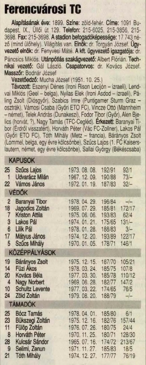 Kategória: Játékoskeret | Címke: 1999/00, Albert Flórián, Baranyai Tibor, Bárányos Zsolt, Bócz Tamás, Bodnár József, Bükszegi Zoltán, Csákvári László, Ebedli Zoltán, Fenyvesi Máté dr., Fülöp Zoltán, Füzi Ákos dr., Gajda István, Gál László, Géczy Thomas, Horváth Péter, igazolások, Jagodics Zoltán, játékoskeret, Kovács Béla, Kovács József dr., Kriston Attila, Kulcsár Sándor, Lakos Pál, Lászka Balázs, Lilik Pál, Mátyus János, Mucha József, Nagy Norbert, Ódor Balázs, Palásthy Norbert, Páncsics Miklós dr., Sallai György, Schultz Levente, Selimi Zenun, szakmai stáb, Szűcs Lajos (kapus), Szűcs Mihály, Torgyán József dr., Tóth Mihály, Udvarácz Milán, Vámos János, Vépi Péter, Zöld Zoltán