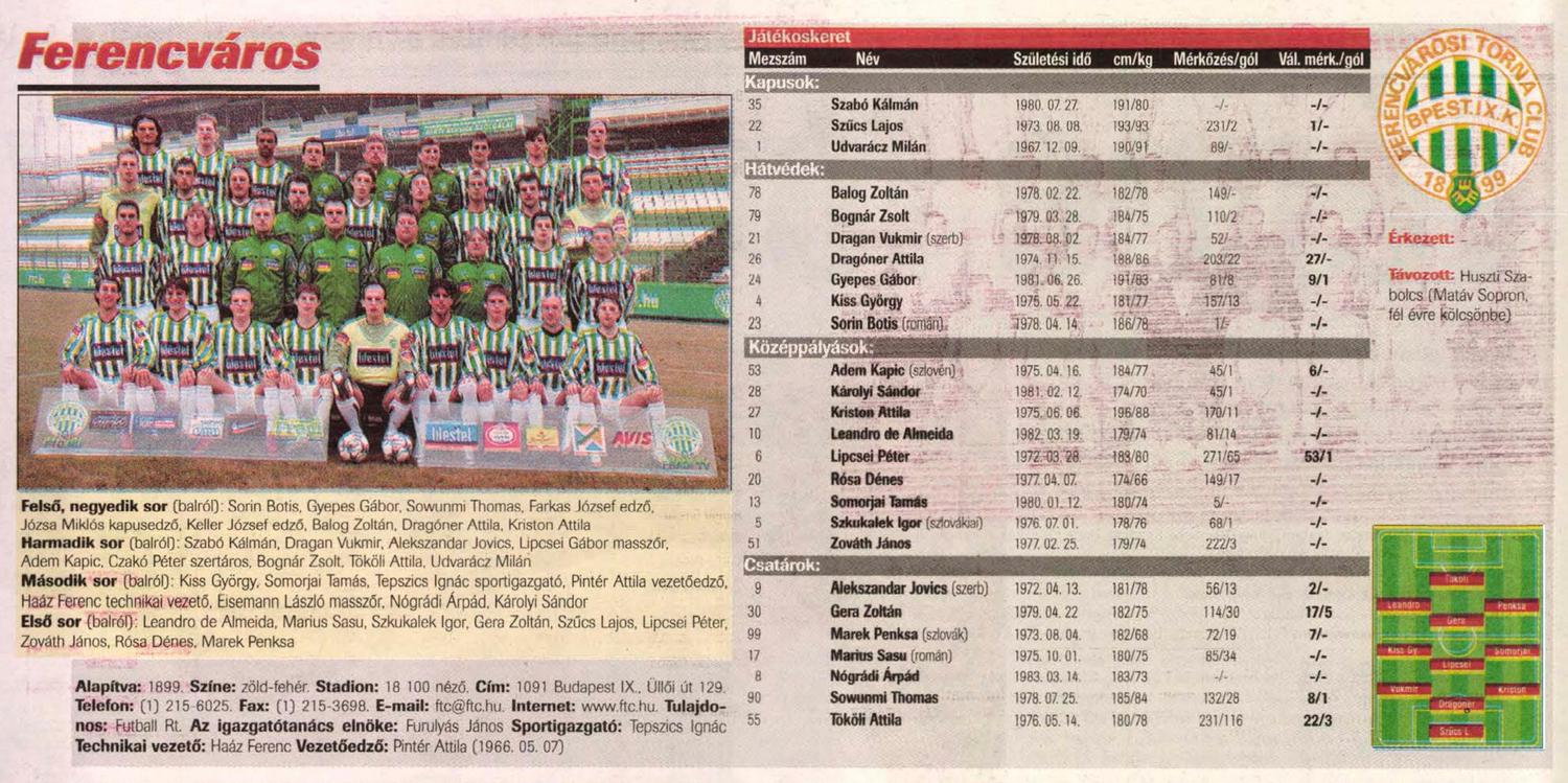 | 4 | Kiss György | 1975. 05. 22. | 181/77 | 157/13 | -/- |