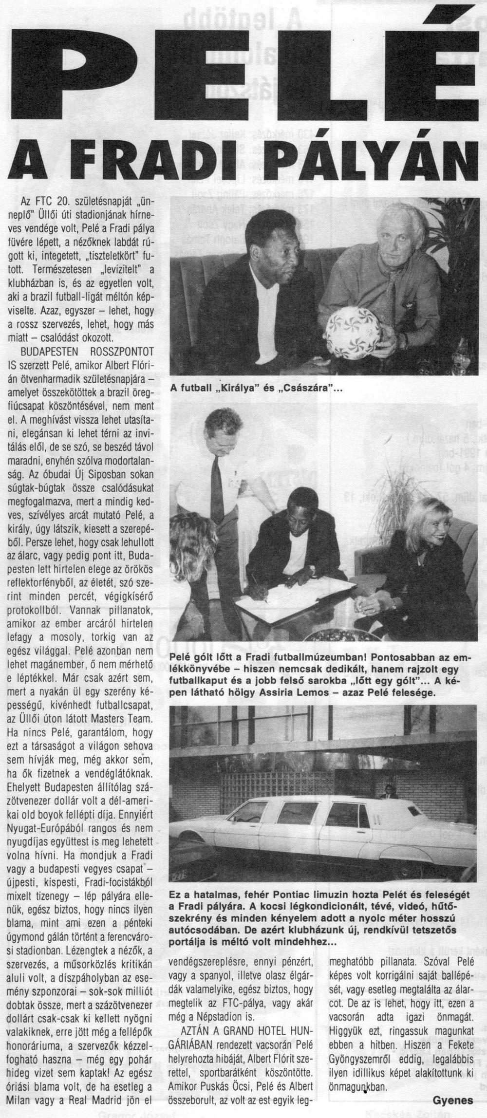 Péntek délután a Kordax Futball Gála keretén belül igazi showműsornak lehettek szemtanúi mindazok, akik kilátogattak az Üllői úti FTC-stadionba. Az egykori válogatott labdarúgókból álló Brasil Masters Team és a Magyar Csillagok csapata közötti mérkőzés előtt ugyanis a Fekete Gyöngyszemként emlegetett Pelé tucatnyi labdát rúgott, illetve fejelt a lelátókra a nézők legnagyobb örömére.