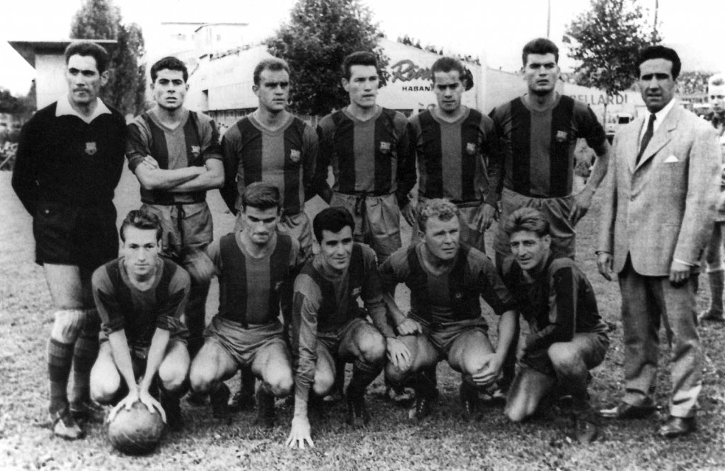 1958.08.24. Young Boys – FC Barcelona. Állnak (balról): Ramallets, Olivella, Brugue, Segarra, Suarez, Gensana, Helenio Herrera edző. Guggolnak: Tejada, Kocsis, Evaristo, Kubala, Czibor. (fotó: Kovács József gyűjteményéből)