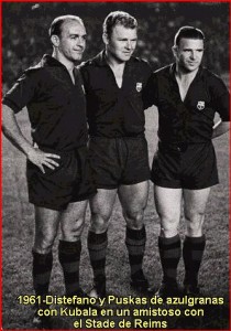 1961.VIII.30. Barcelona – Stade Reims. Kubala, Puskás és Di Stefano Kuksi búcsúmeccsén