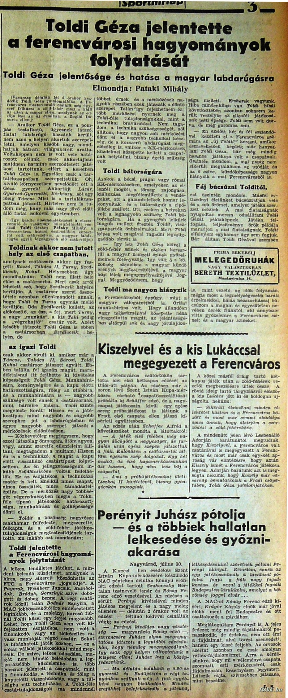 A lelkes, lendületes játékot, a mindent beleadó küzdelmet, amelynek a híres, nagy sikereit köszönhette az FTC, a Ferencváros „jogelődje”. A Payerok, Welnbeer Jancsik, Rumboldok, Bródyk, Gorszkyk szíve dobogott és dobog benne. A régi csatárok közül talán Bodnár Sanyira, a MAC jobbösszekötőjére emlékeztetett leginkább, de a mokány, karcsú fiúnál Toldi közel egy fejje] magasabb.
