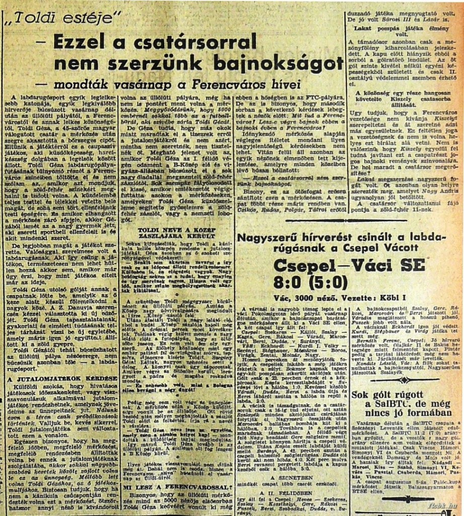 Bizonyos, hogy as Üllői úti mérkőzés mind az 5.000 nézője elsősorban Totói Géza kedvéért vonult ki még ebben a hőségben is az FTC-pályára. De az is bizonyos, hogy második sorban a következő kérdések lebegtek a nézők előtt: Mit tud a Ferencváros? Lesz-e végre bajnak ebben a bajnoki évben a Ferencváros?