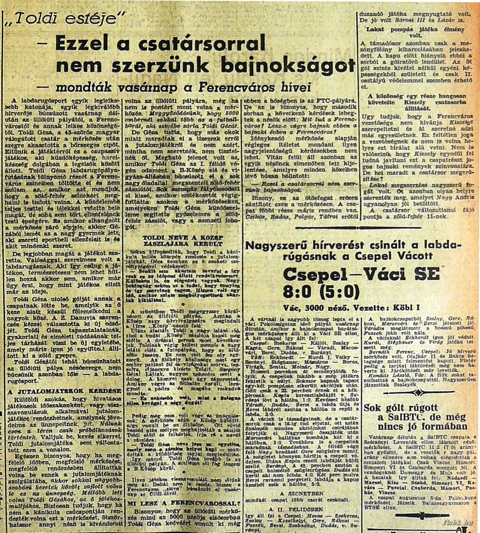 De Géza tudta, hogy más okok miatt maradtak el a tízezrek erről a jutalomjátékról és nem azért, mintha nem szeretnék, nem tisztelnék őt. Megható jelenet volt az, amikor Toldi Géza az I. félidő végén odament a B-Közép elé és vigyázzállásban búcsúzott el s sok nagy diadallal megszentelt zöld-fehér zászlótól. Sok szempár fátyolosodon el kissé, amikor emlékezetét végigfuttatta azokon a mérkőzéseken, amelyeken Toldi Géza küzdőszelleme segítette győzelemre a zöld-fehér zászlót, vagy a nemzeti lobogót.
