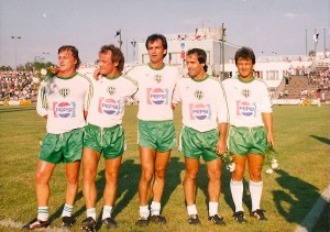 Négyen az 1980/81-es bajnokcsapatból: Pusztai, Nyilasi, Ebedli, Szokolai. A háttérben: Novák Dezső, az edző.