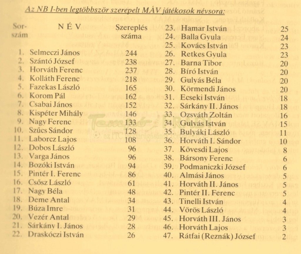 Az NB I-ben legtöbbször szerepelt MÁV játékosok névsora: