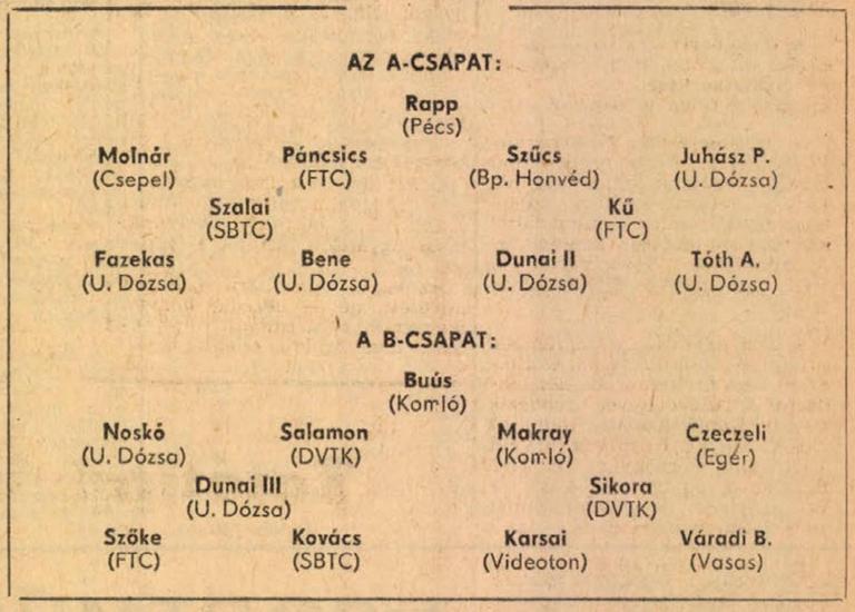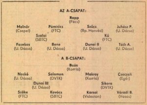 Magyarország: Géczi (FTC) — Fábián (Vasas), Kovács (Videoton), Vidáts (Vasas), Juhász P. (Ú. Dózsa) — Juhász I. (FTC), Szűcs (Honvéd) — Fazekas (Ú. Dózsa), Bene (Ú. Dózsa), Dunai II. (Ú. Dózsa), Zámbó (Ú. Dózsa)
