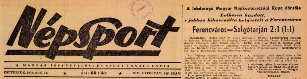 Végre kupadöntő! – lelkesedett a Népsport újságírója az 1955-56-ban megkezdett, és 1958. augusztus 20.-án a döntőhöz ért Magyar Népköztársasági Kupa beharangozó írásában. Egy kattintás ide a folytatáshoz....