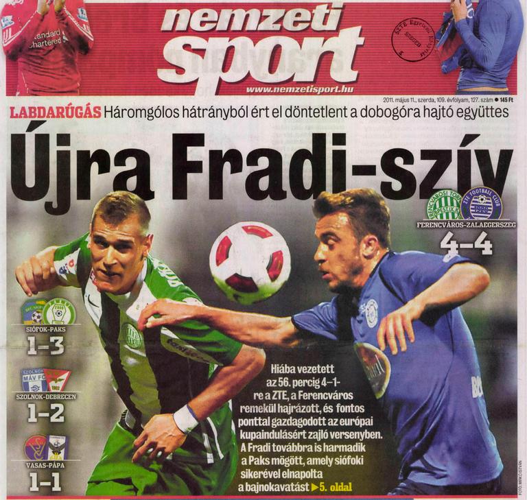 Emlékezetes mérkőzést játszott az Üllői úton a Ferencváros a Zalaegerszeggel. Az NB I 28. fordulójának meccsén Csank János együttese a szünetben már 4–1-re vezetett a vezetőedző korábbi csapata ellen, de a második félidőben felállt a padlóról a hazai gárda, és 4–4-re mentette az összecsapást. A megszerzett egy pontnak köszönhetően a Fradi némileg megerősítette helyét a bajnoki tabella harmadik helyén, míg a kék-fehéreknek lassan bravúrra lenne szükségük ahhoz, hogy a dobogón zárják a szezont. Egy kattintás ide a folytatáshoz....