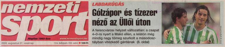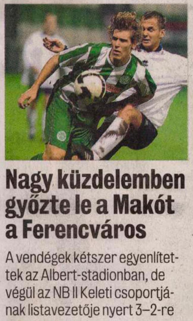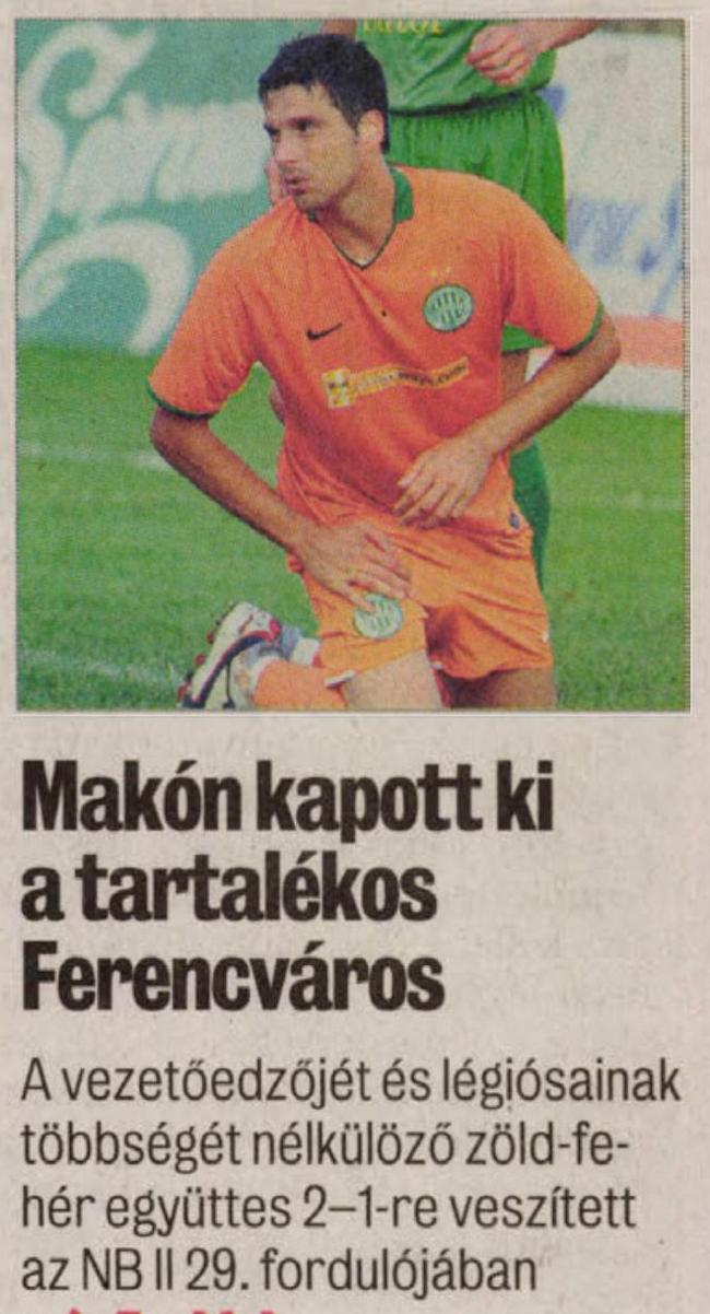 Továbbra sem megy a Ferencvárosnak a labdarúgó NB II-ben. Az élvonalból a 2006–2007-es szezon előtt száműzött, de ebben az évben is a visszajutást megcélzó zöld-fehér együttes ezúttal a Makó ellen volt képtelen kiharcolni a győzelmet. Az 1-1-es döntetlen azt jelenti, hogy a Fradi tovább rontott a forduló előtti pozícióján, és most már csak nyolcadik a táblázaton. Sőt ha a Vác holnap pontot szerezne a Sport utcában, Csank János csapata a 9. helyről készülhetne a 8. játéknapra. Úgy tűnik, az ország legnépszerűbb csapata belesüllyedhet a középszerűségbe a második vonalban is.