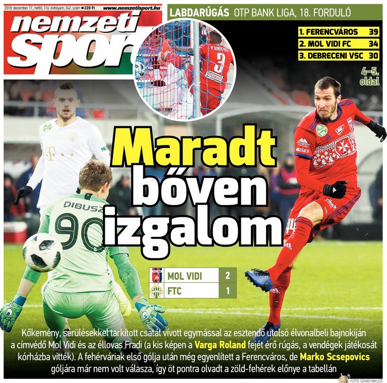 Hatalmas, csontzenés küzdelemben 2–1-re nyert odahaza a Mol Vidi FC a Ferencváros ellen a labdarúgó NB I 18. fordulójának, és egyben a 2018-as év utolsó bajnoki mérkőzésén.