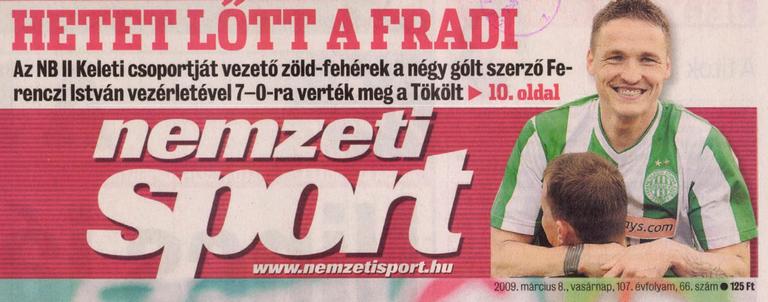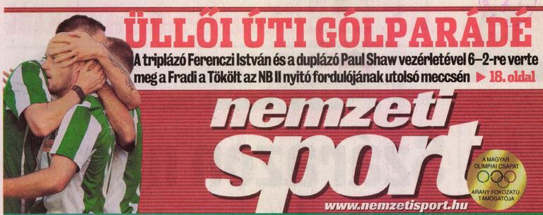 A Ferencváros magabiztos győzelmet aratott a labdarúgó másodosztály Keleti csoportjának hétfői összecsapásán a Tököl ellen. Az 1. forduló záró mérkőzésén Ferenczi István mesterhármast szerzett, mellette Paul Shaw volt kétszer eredményes a Fradiban. A vendégcsapatban Csabai Tamás, Gasparik András és Gálhidi Gergő talált be, apró szépséghiba azonban, hogy utóbbi játékos saját kapusát mattolta. A vége 6–2 lett.