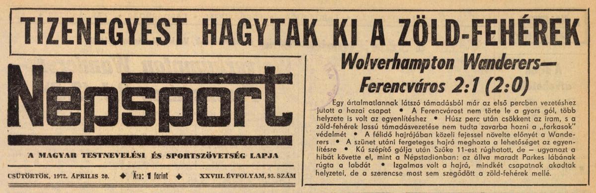 1972.IV.19. UEFA, Wolverhampton – Ferencváros 2:1